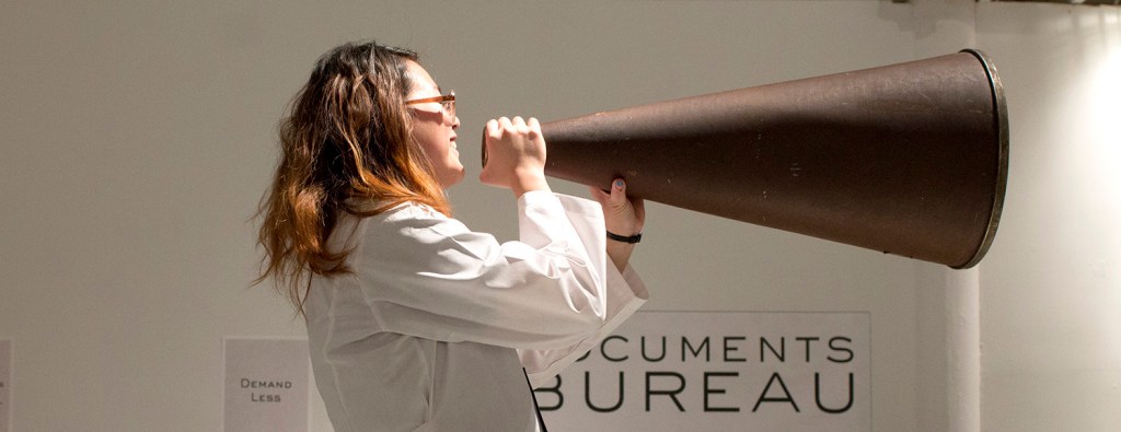 Documents Bureau is a playful arena for questioning our daily interactions. Participants’ universal experiences with daily business transactions become a lingua franca for improvisation and enable instances of the carnivalesque, a concept coined by Russian philosopher and literary critic, Mikhail Bakhtin. What happens during carnival? The king gets deposed, the most improbable people cavort together, and the social order is temporarily turned on its head. All this points us, in Bakhtin’s words, to the “joyful relativity of all structure and order”.